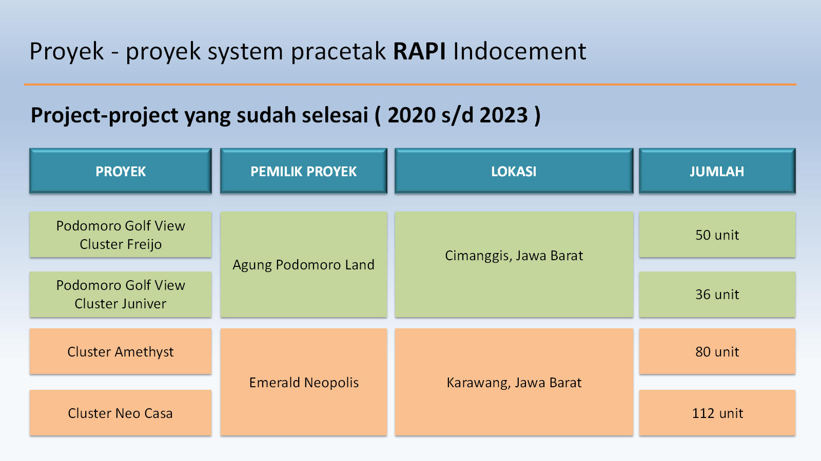 Project Penggunaan RAPI dalam perumahan-perumahan skala besar berdampak signifikan terhadap mutu, efisiensi waktu, tenaga kerja, biaya, yang tentunya lebih ekonomis dibandingkan dengan penggunaan bahan-bahan konvensional.
